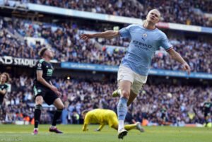 أحرز النرويجي إرلينج هالاند مهاجم فريق مانشستر سيتي الأول لكرة القدم، هدفين ليعادل الرقم القياسي لعدد الأهداف في موسم واحد، ضمن الدوري الإنجليزي، بعدما قاد فريقه للفوز 3-1 على ضيفه المتعثر ليستر سيتي، السبت.
