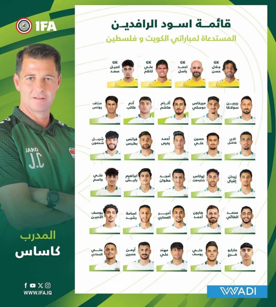 أعلن مدربُ المنتخب الوطنيّ “خيسوس كاساس” قائمةَ اللاعبين النهائية المُستدعاة لمواجهتي منتخبي الكويت و فلسطين ضمن جولةِ التصفياتِ المؤهلة لمونديال 2026، والتي تألفت من (29) لاعباً هم كل من : جلال حسن ، أحمد باسل ، علي كاظم ، كميل سعد، اكام هاشم ، مناف يونس ، ريبين سولاقا ، آدم طالب، فرانس ضياء ، حسين علي ، الاي فاضل ، شربل شمعون ، أمير العماري ، محمد الطائي ، لوكاس شليمون ، أمجد عطوان ، إبراهيم بايش، يوسف أمين ، علي جاسم ، أسامة رشيد ، هارون أحمد ، زيدان إقبال ، ميرخاس دوسكي ، أحمد يحيى ، ماركو فرج ، علي يوسف ، علي الحمادي ، مهند علي ، أيمن حسين.