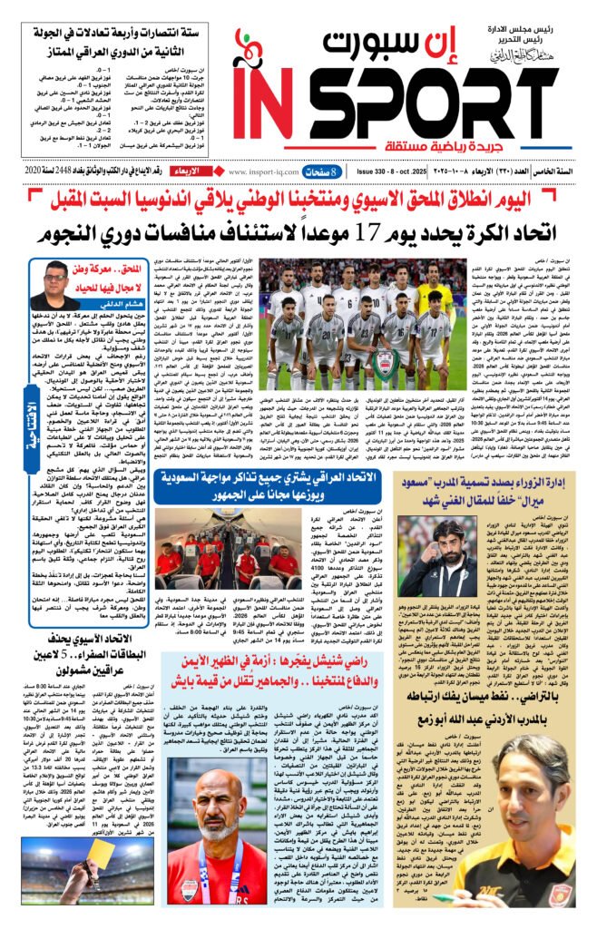 اخر الاخبار الرياضة العراقية عدد اليوم العدد (330) 8 – 10 -2025 4 أشهر ago Continue Reading Previous النصر يفوز على النوارس الزوراء بثنائية نظيفةNext الملحق.. معركة وطن لا مجال فيها للحياد اخبار ذات صلة اخر الاخبار الرياضة العراقية الكره العالمية الريال يجهز روديجر وأرنولد يوم واحد ago اخر الاخبار الرياضة العراقية الكره العالمية حتى 2030.. باريس يخطف موهبة برشلونة يوم واحد ago اخر الاخبار الرياضة العراقية الكره العالمية في مباراته الأولى.. شباك تيرشتيجن تهتز يوم واحد ago اترك تعليقاً إلغاء الردلن يتم نشر عنوان بريدك الإلكتروني. الحقول الإلزامية مشار إليها بـ *التعليق * الاسم * البريد الإلكتروني * الموقع الإلكتروني احفظ اسمي، بريدي الإلكتروني، والموقع الإلكتروني في هذا المتصفح لاستخدامها المرة المقبلة في تعليقي.
