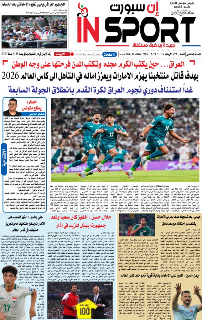اخر الاخبار عدد اليوم العدد (360) 19 -11- 2025 شهرين ago Continue Reading Previous العدد (355) 12 – 11- 2025Next خطاره يطلع متونس اخبار ذات صلة اخر الاخبار الرياضة العراقية الكره العالمية الريال يجهز روديجر وأرنولد يوم واحد ago اخر الاخبار الرياضة العراقية الكره العالمية حتى 2030.. باريس يخطف موهبة برشلونة يوم واحد ago اخر الاخبار الرياضة العراقية الكره العالمية في مباراته الأولى.. شباك تيرشتيجن تهتز يوم واحد ago اترك تعليقاً إلغاء الردلن يتم نشر عنوان بريدك الإلكتروني. الحقول الإلزامية مشار إليها بـ *التعليق * الاسم * البريد الإلكتروني * الموقع الإلكتروني احفظ اسمي، بريدي الإلكتروني، والموقع الإلكتروني في هذا المتصفح لاستخدامها المرة المقبلة في تعليقي.