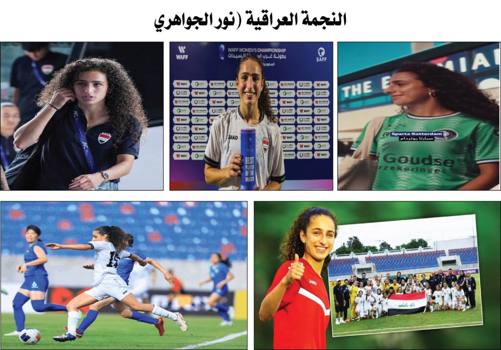 قدّمت اللاعبة المغتربة في هولندا (نور الجواهري) مستوى استثنائية للرياضية العراقية التي تجمع بين الكفاءة العلمية والموهبة الكروية، إذ تظهر في البطولة الاخير في غرب اسيا بانها طاقة عراقية كبيرة وتجمع بين طبيبة ومهاجمة لمنتخب العراق ، في مشهد يُبرز حجم التحدي والطموح الذي تحمله في آنٍ واحد. لم تكن لاعبة عادية ، بل نموذج مميز استطاع أن يلفت الأنظار داخل الملعب وخارجه.