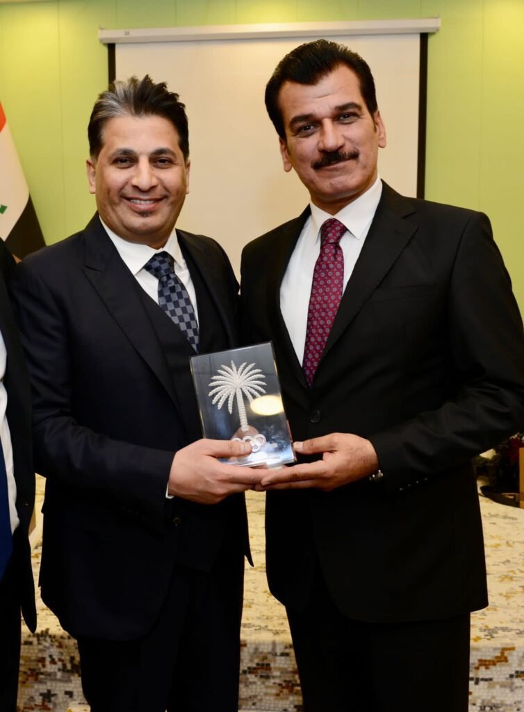 وفي ختام الحفل قدم الدكتور عقيل مفتن درع اللجنة الاولمبية للقاضي محمد علي محمود نديم تقديرا لجهوده الكبيرة وتثمينا لدوره المهم في تأسيس مركز التسوية.