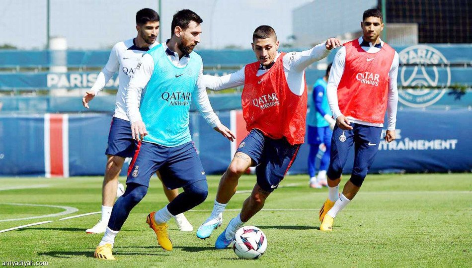 صورة التقطت أمس الأول للأرجنتيني ليونيل ميسي، مهاجم باريس سان جيرمان، يحاول المرور من الإيطالي ماركو فيراتي، لاعب الوسط، خلال الحصة التدريبية (المركز الإعلامي ـ بي إس جي)